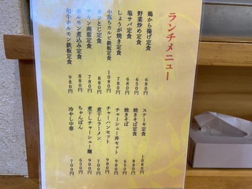 メニューはから揚げ定食から、ステーキ定食、塩サバ、ラーメン、チャーハンと種類が豊富!