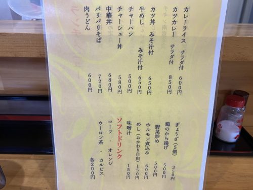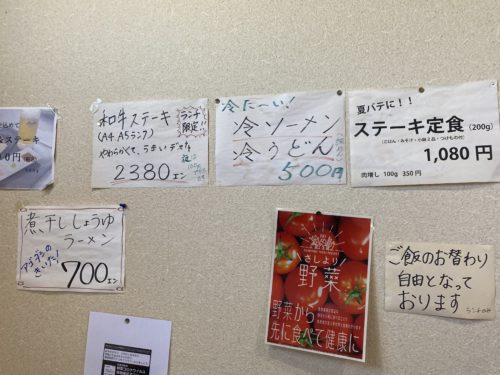 壁に貼られたメニューもチェック!冷やし中華や煮干しラーメン、なんと!ごはんのお替り自由!