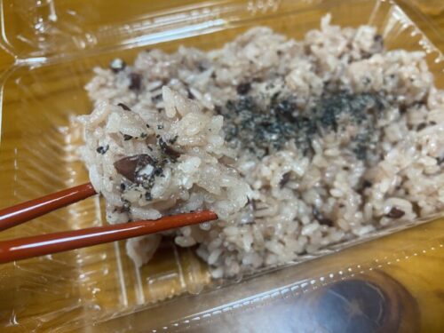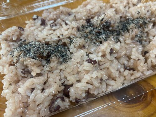 小豆自体の優しい甘さのお赤飯。ごまおはぎにも使われているごまが上にかかっています。