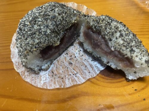 香ばしくてしゃりしゃりとしたごまの食感が楽しいごまおはぎ。中にはこしあん入り。
