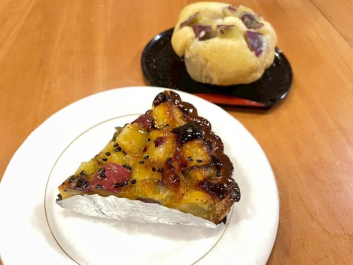 中でも、つやつやと光り輝いていたさつまいものタルトと、お芋の蒸しパンを食べてみることにしました。