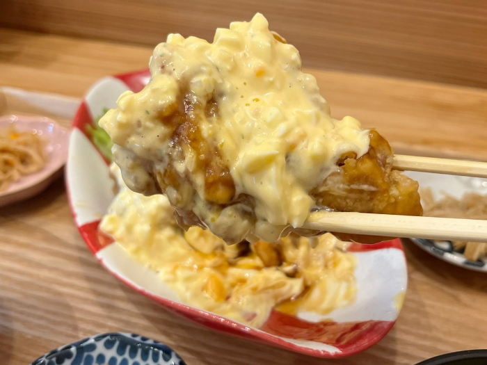 チキン南蛮には、特製のタルタルがたっぷり掛かっています。チキン南蛮がほとんど見えません。タルタルは玉子が多めのタイプで、絶対美味しいやつ。
