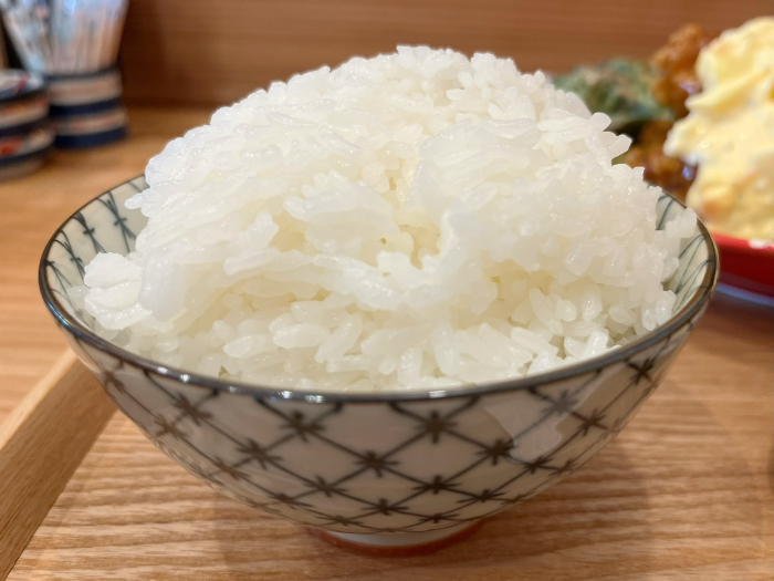 ごはんは一般的なサイズのお茶碗にこんもりと盛られています。普通盛りでも240gあるそう。これでもかなり量が多いんですが、お代わりが無料。お腹いっぱい食べられますね。