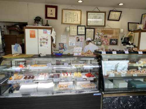 ショーケースにケーキやお菓子が並ぶ立派なお菓子屋さん。