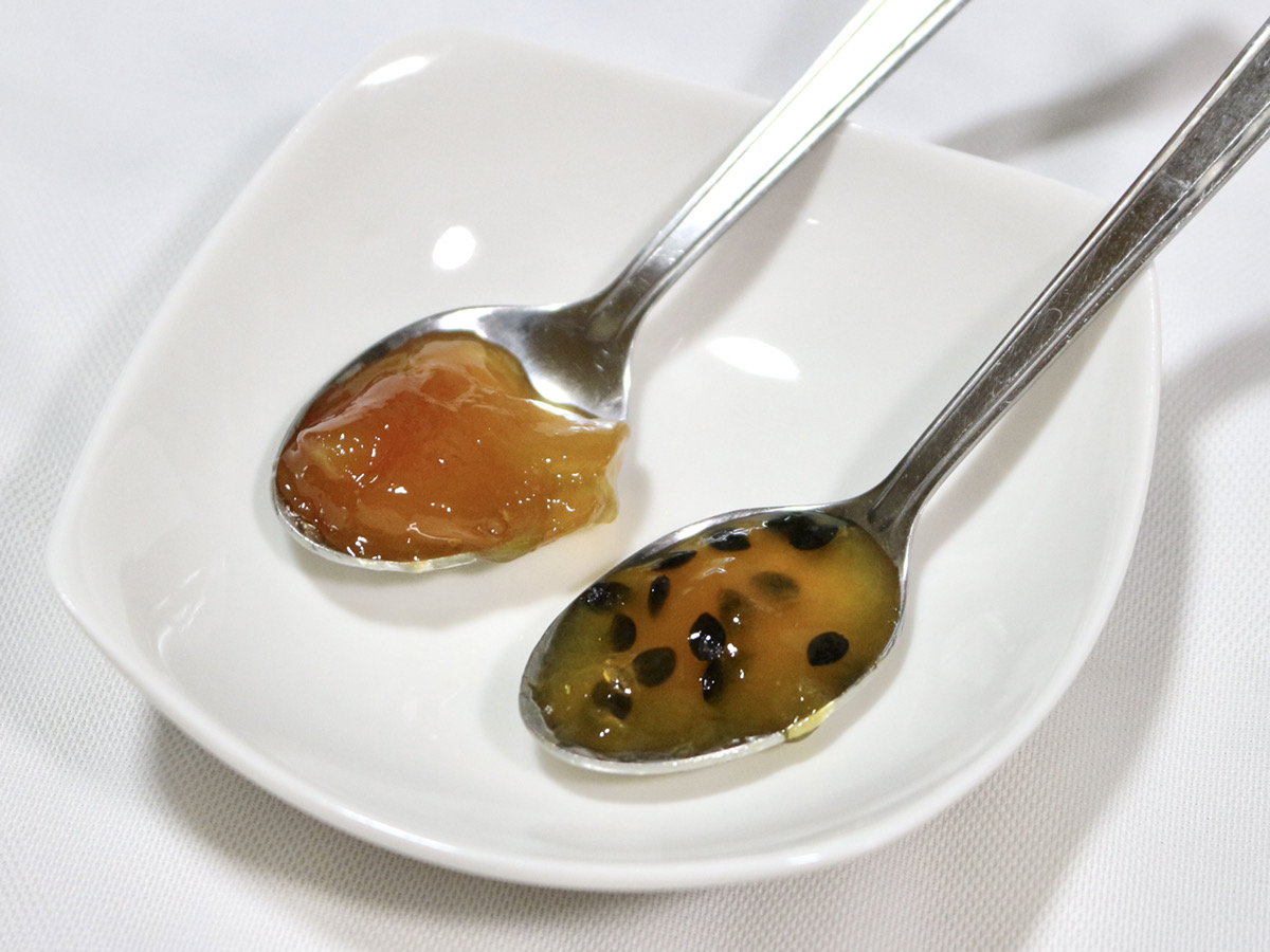 「お菓子のアトリエAya」のイチオシのコンフィチュールを食べてみました!おすすめの【トマトオレンジ】【パッションフルーツ】をセレクト。
