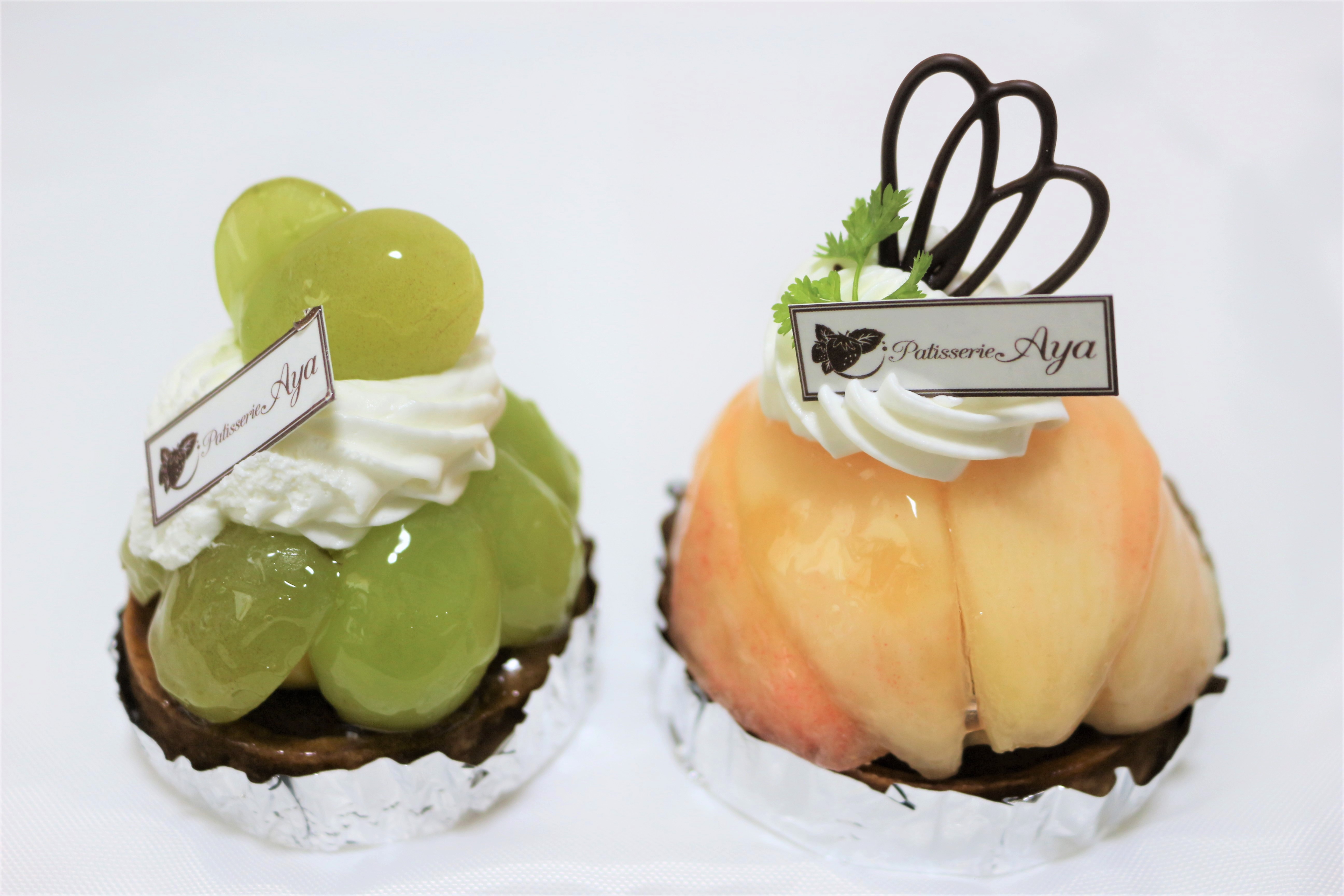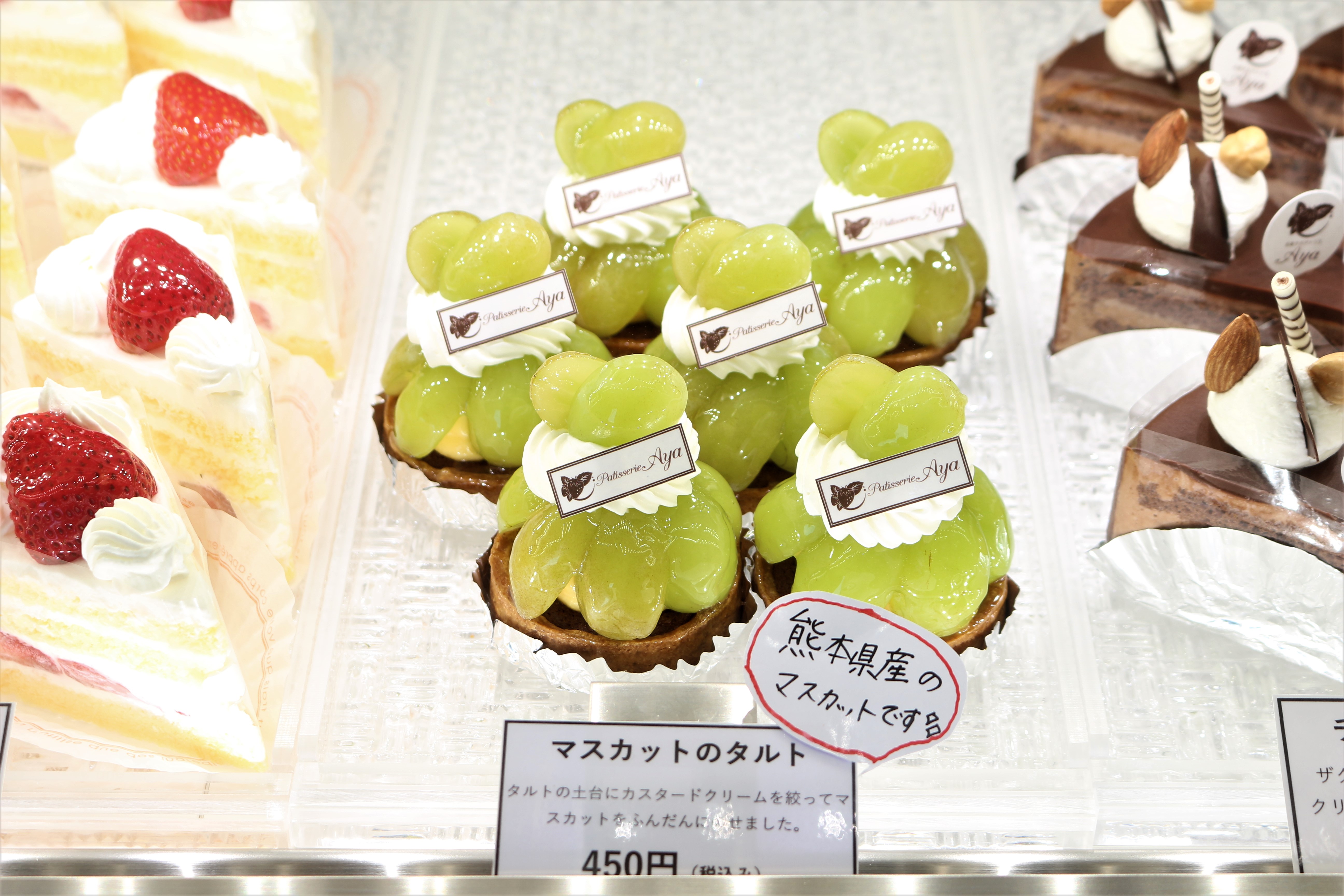 「お菓子のアトリエAya」には、旬のフルーツをふんだんに使ったケーキがたくさんあります。この日は熊本県産のマスカットのタルトがありました。可愛い。