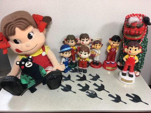 「普段は公開していませんが…」と、特別に、社長室に飾られている年代物のペコちゃん人形コレクションも見せていただきました。