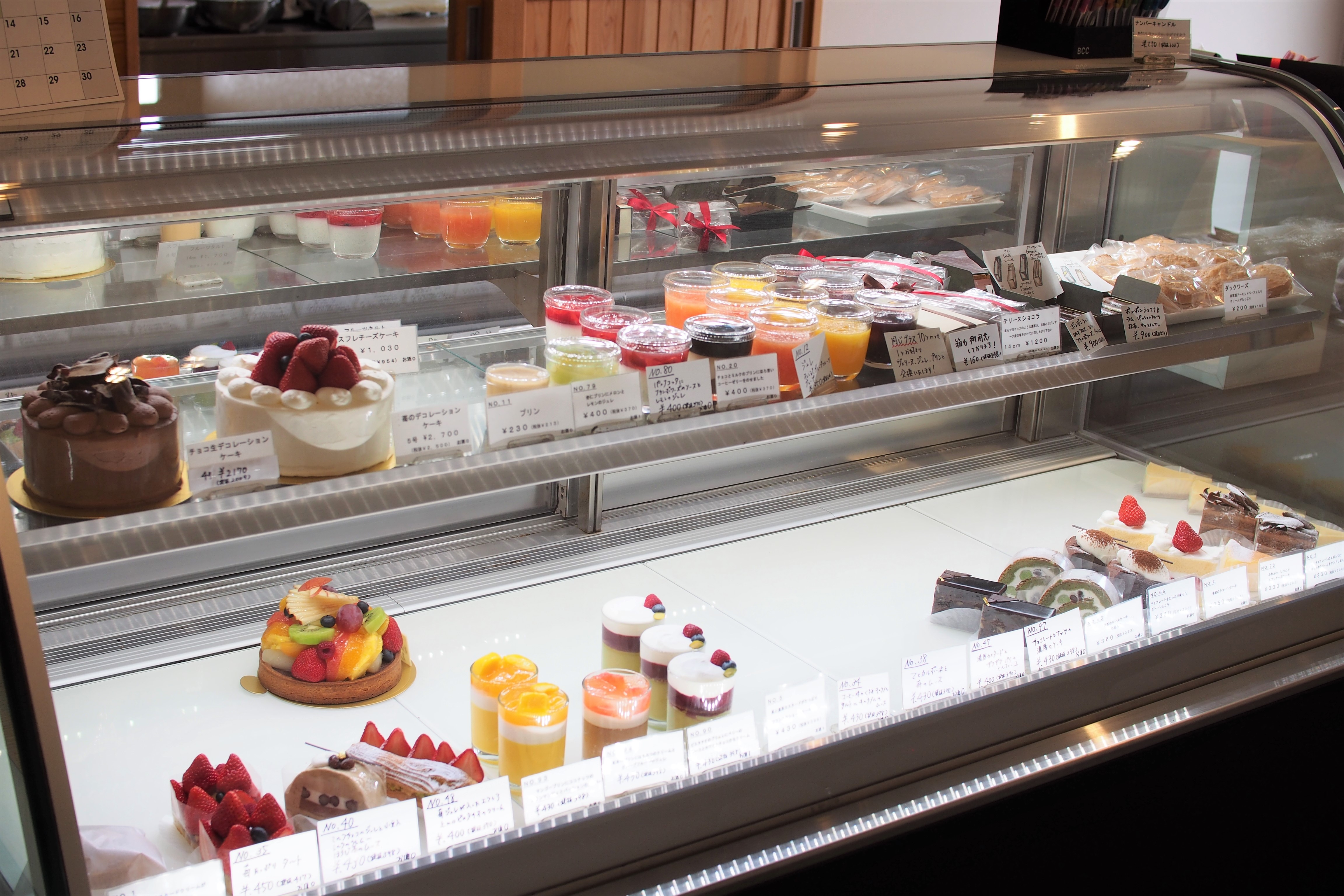 メインのショーケースには、カットケーキやホールケーキ、見た目にも鮮やかな季節限定商品のジュレなどが並びます。