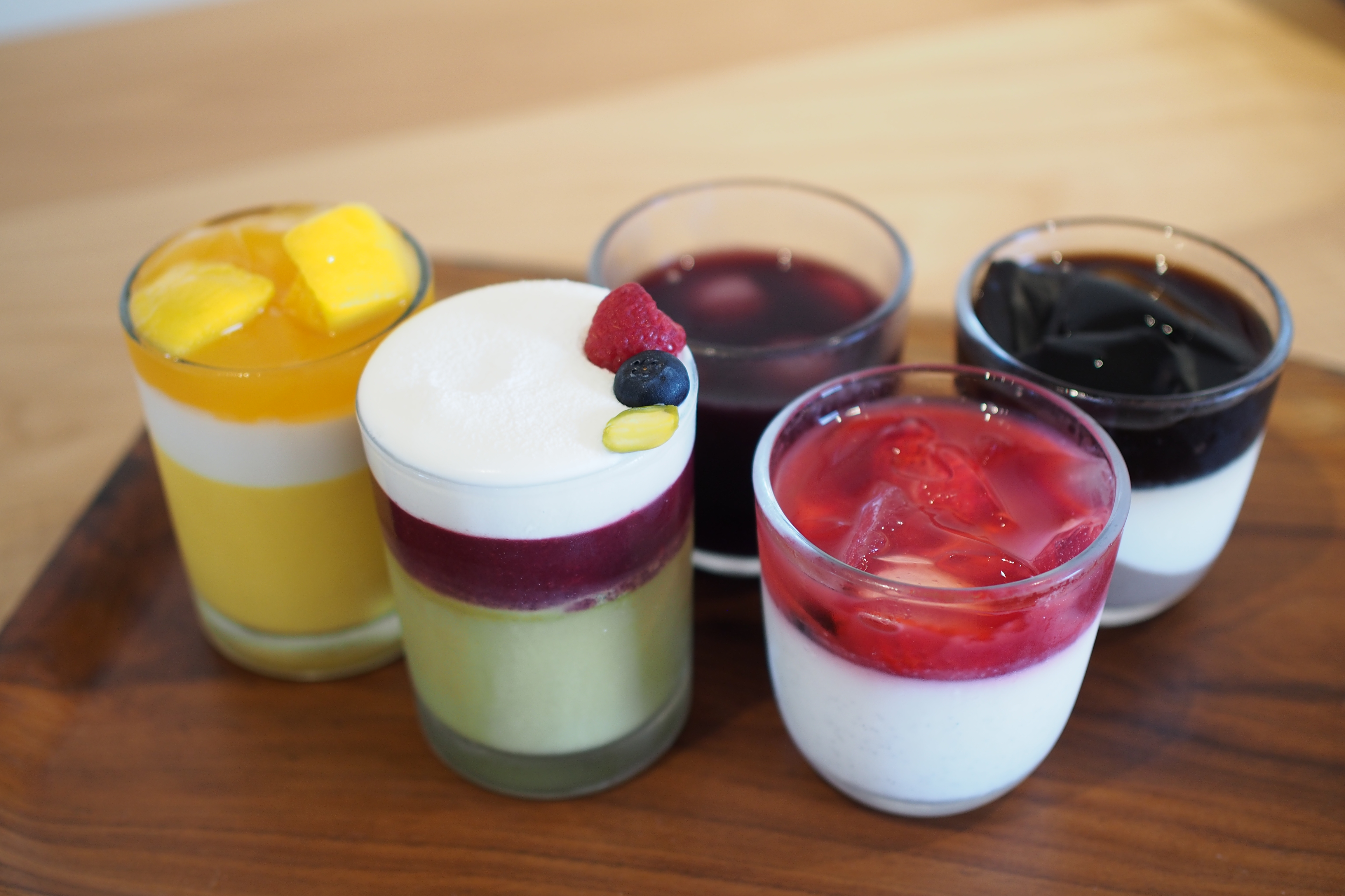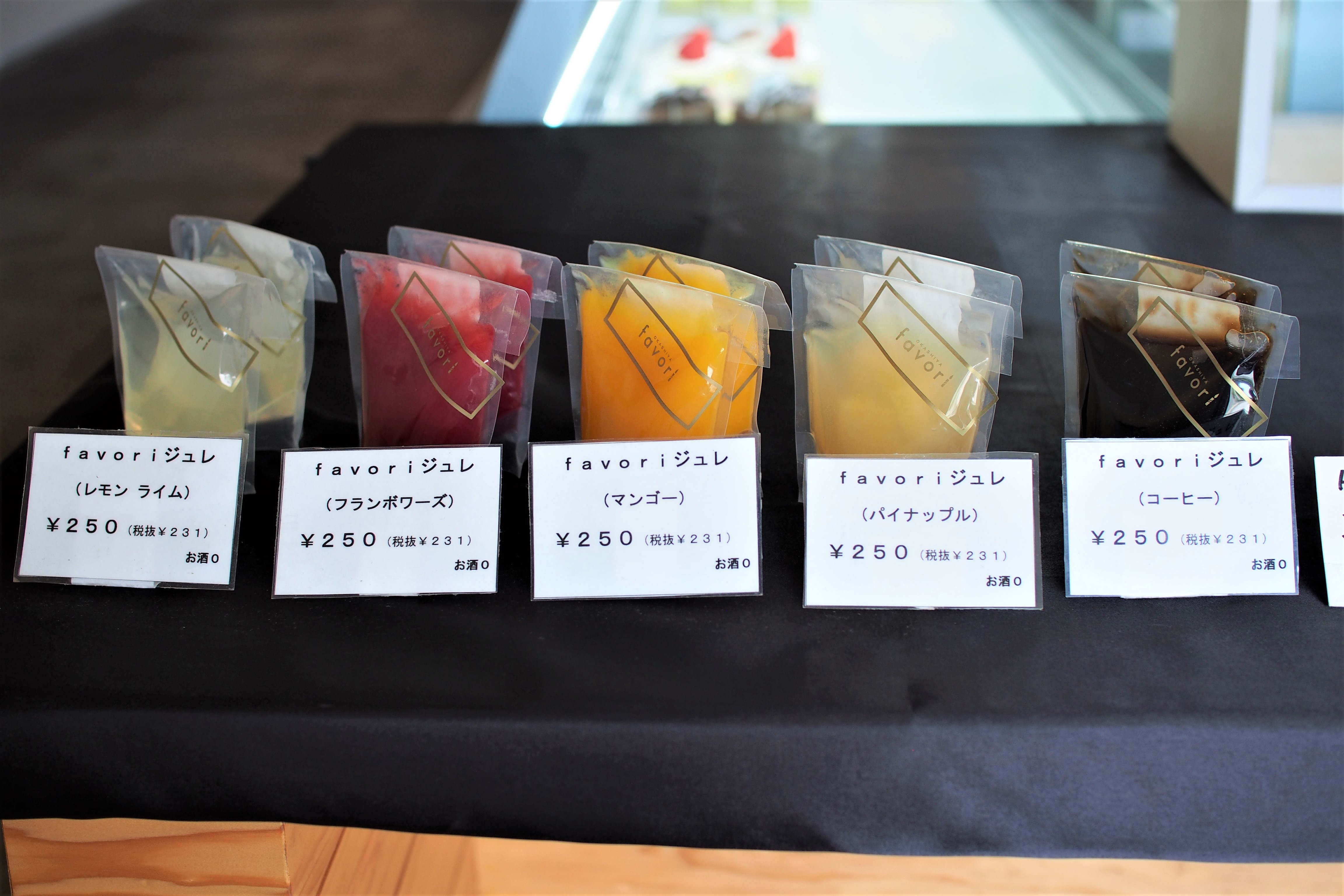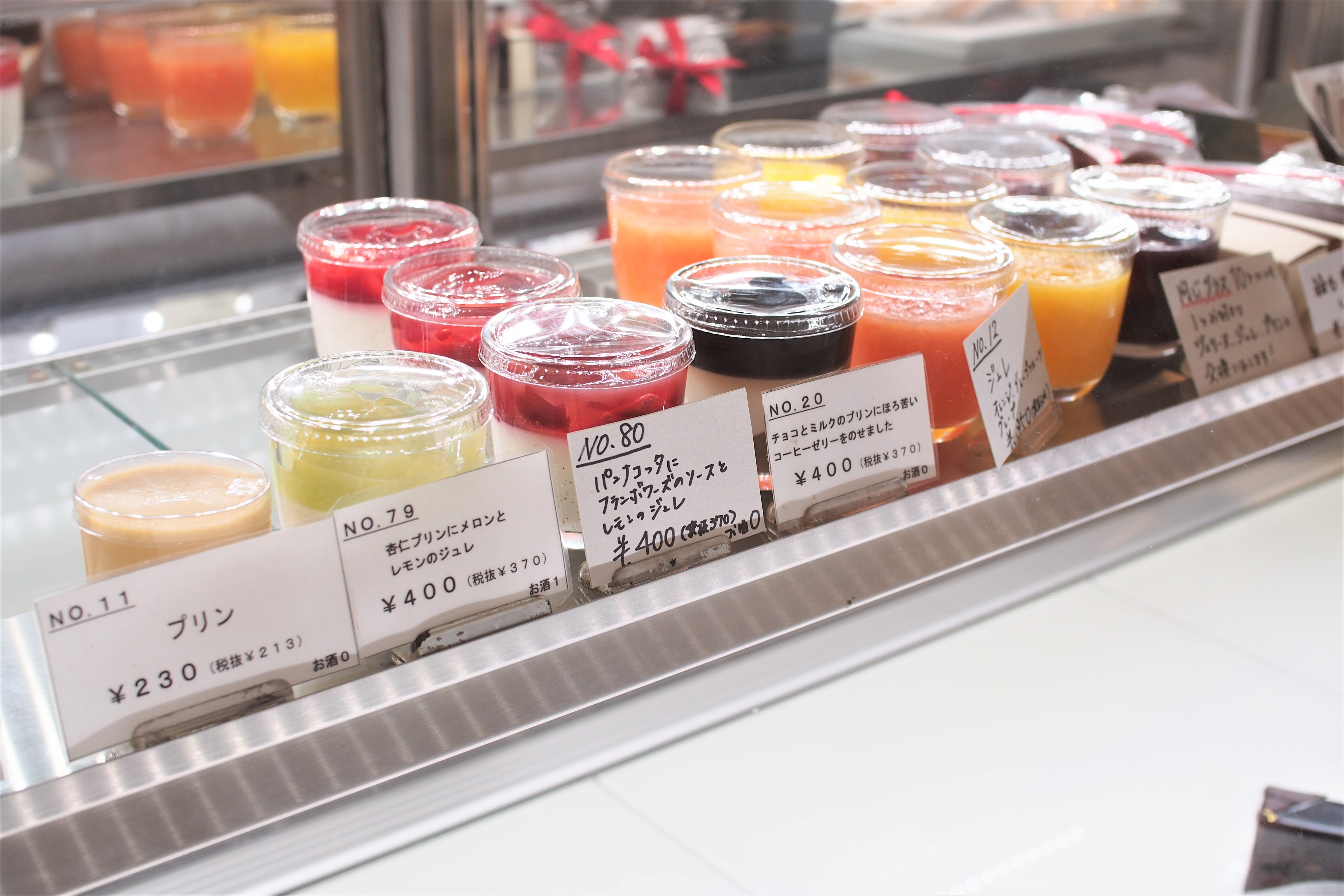 ショーケースの中でもひと際目を引く、彩り豊かなジュレ¥350(税込み)やパンナコッタ¥400(税込み)は、今の季節の期間限定商品。