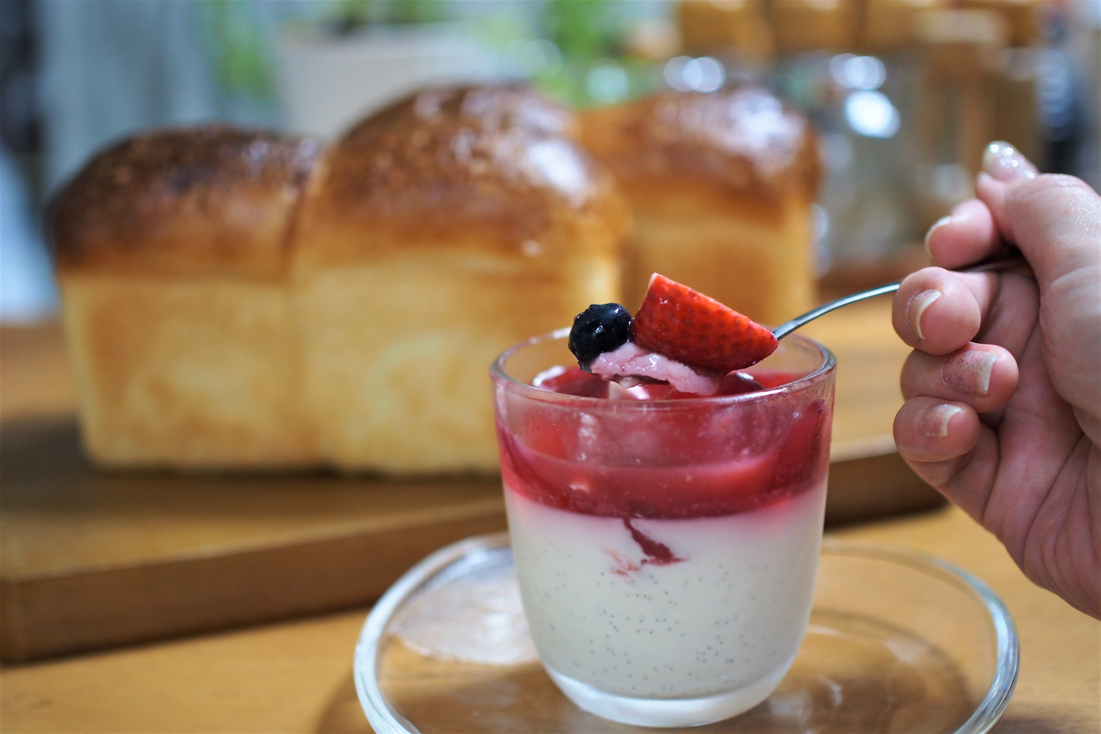 こちらは、ブルーベリーとイチゴの果実も入っていて見た目にも可愛い一品。パンナコッタ(ムース)の程よい甘みとフランボワーズのソースとレモンのジュレのほのかな酸味との相性がバッチリです。