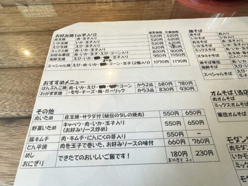 お好み焼き・焼きそば以外にも肉炒め、野菜炒めなどもあります。