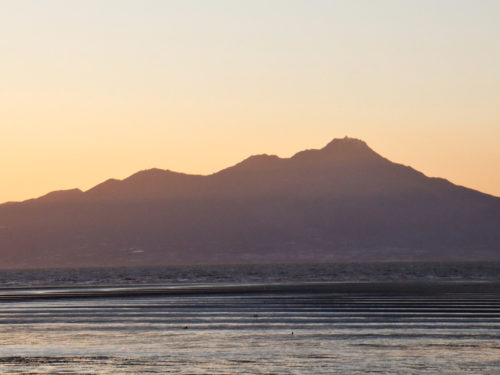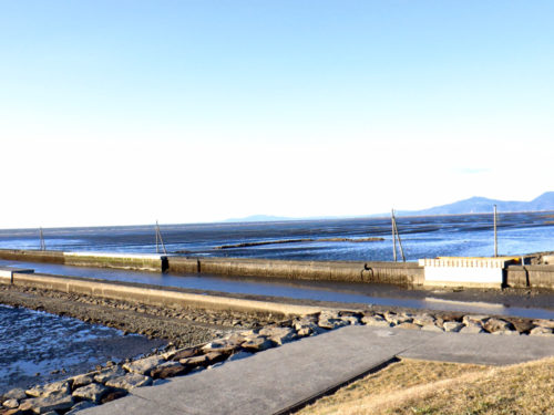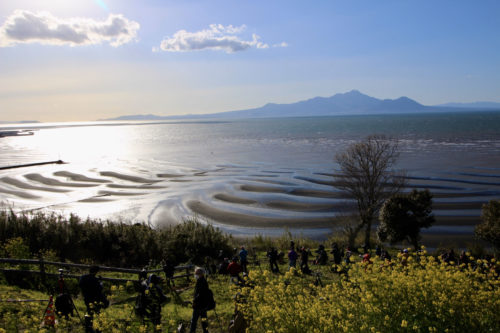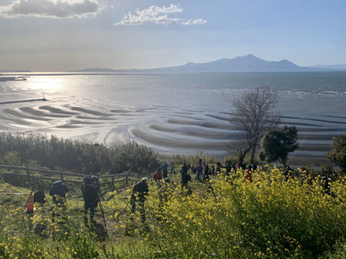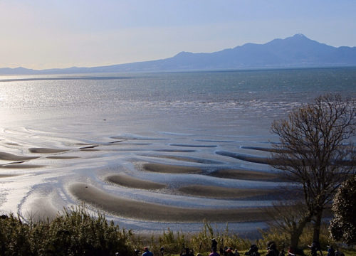 有明海に現れる独特の砂紋と、その向こうの雲仙普賢岳。いつまでも守りたい、美しい海岸でした。