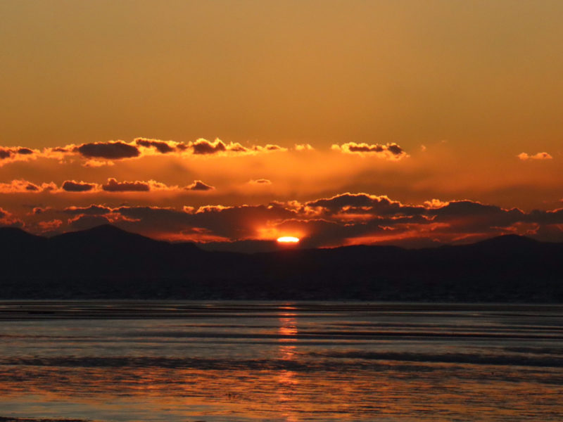 日の入りが近づくにつれ、御輿来海岸が本気出してきました。オレンジ色のシマシマ模様が海面に浮かび上がります。「日本の渚百選」、「日本の夕日百選」の本領発揮とも言うべき、美しい夕焼けです。