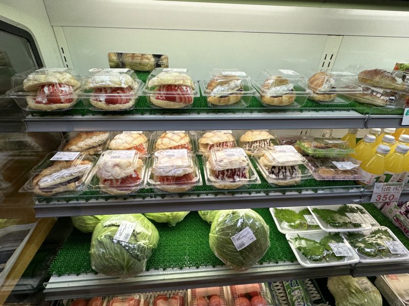 冷蔵ショーケースに野菜と並んで目を引くメロンパン達。