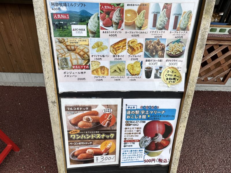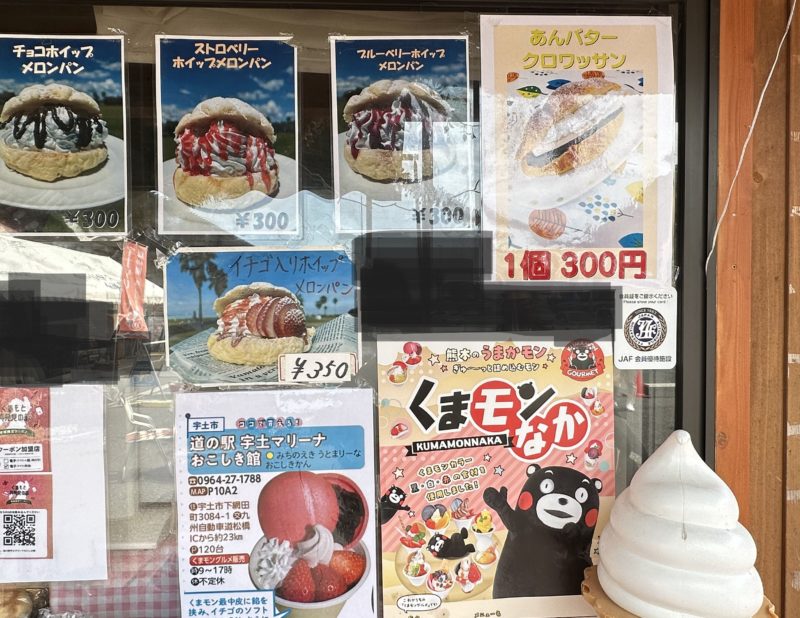 道の駅宇土マリーナの「おこしき館」へ。ここは、海岸沿いにあり、お魚屋さんもあって魚介類が新鮮でお得に販売されているんです。春の魚介類を求めて行ってきたのですが、品ぞろえが豊富で目移りしていまい「ホイップメロンパン」で春の映え写真を撮るドライブに変更したお話です。
