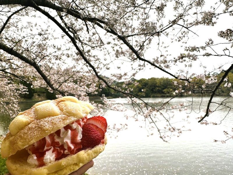 立岡自然公園で舞い散る桜とイチゴホイップメロンパン。
