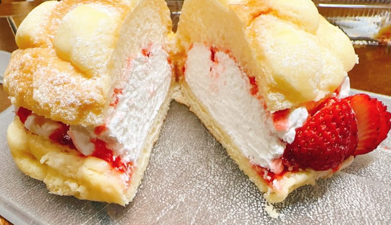イチゴホイップメロンパンの中身は甘さ控えめのホイップがたっぷり入って食べ応えがあります。