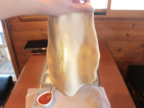 今度はピザ生地のばし。均等に、そして破けないように丁寧に丁寧にのばしていきます。