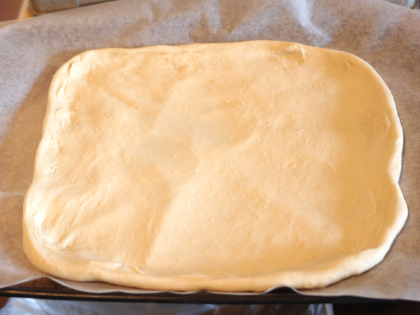 おぼんの大きさに生地を広げ、