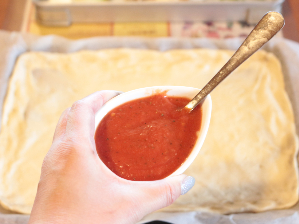 オリジナルのピザソースをたっぷりと。
