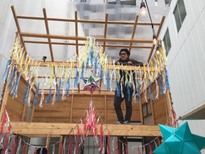 坂口恭平氏が建てたモバイルハウスも、「カミアカリ」の演出で、かわいく装飾されています。2階から街なかを見下ろしてみる楽しみも…。