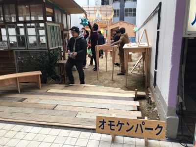 今回、OMOKIビル跡地「オモケンパーク」を利用して出現した公園。子供たちが積木で遊んだり、絵本を読んだり、大人がコーヒーを楽しんだり、ゆったりした時間が流れていました。この土地は、今後は建物を建てず、様々な人たちと面白い活動をしていく空間として利用されるそうです。これから、どんなわくわくすることが展開されていくのか楽しみな空間です。