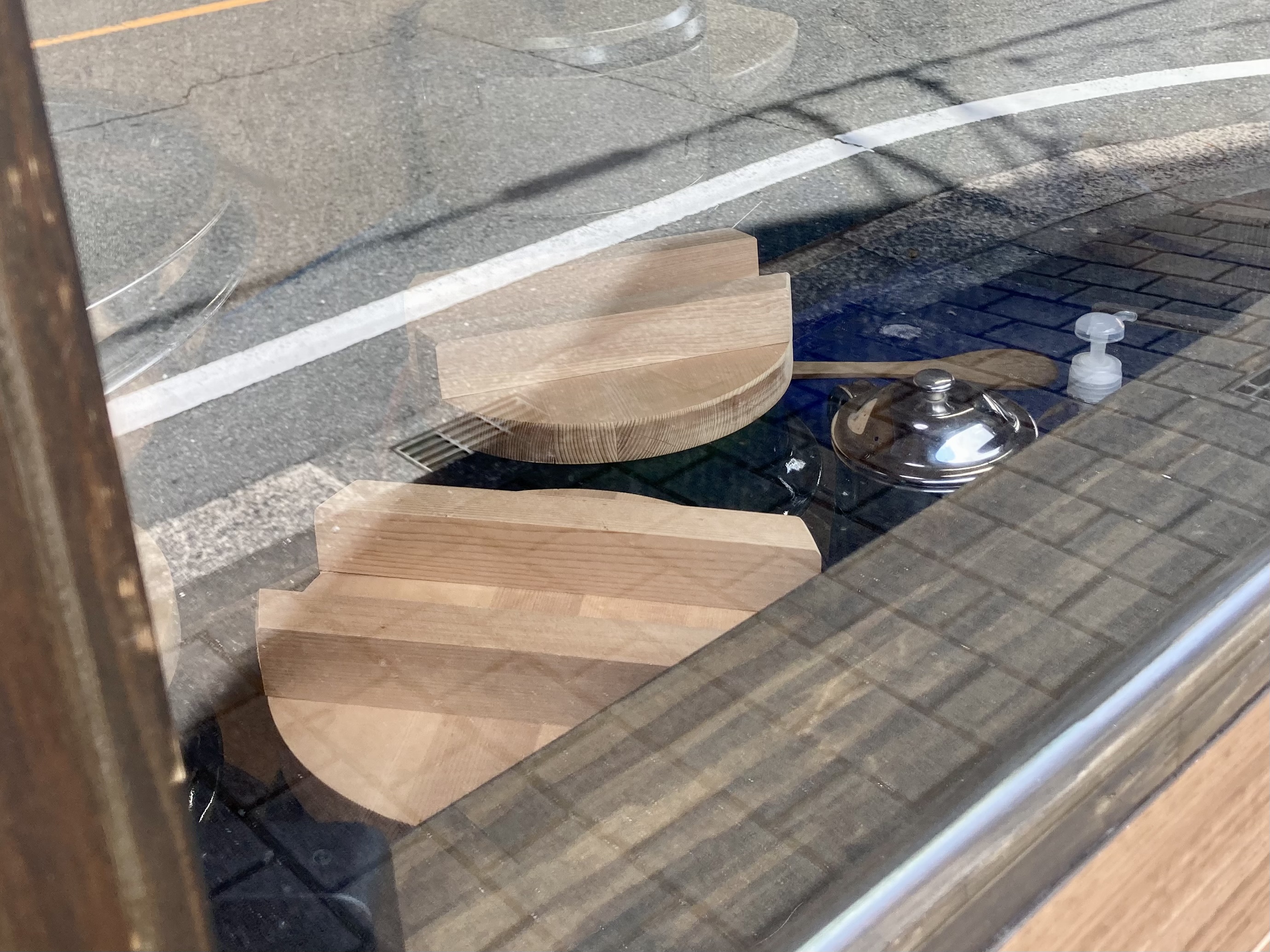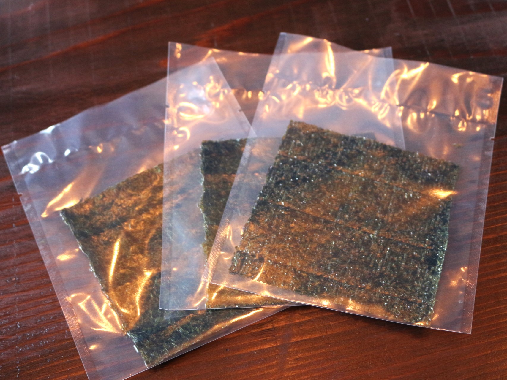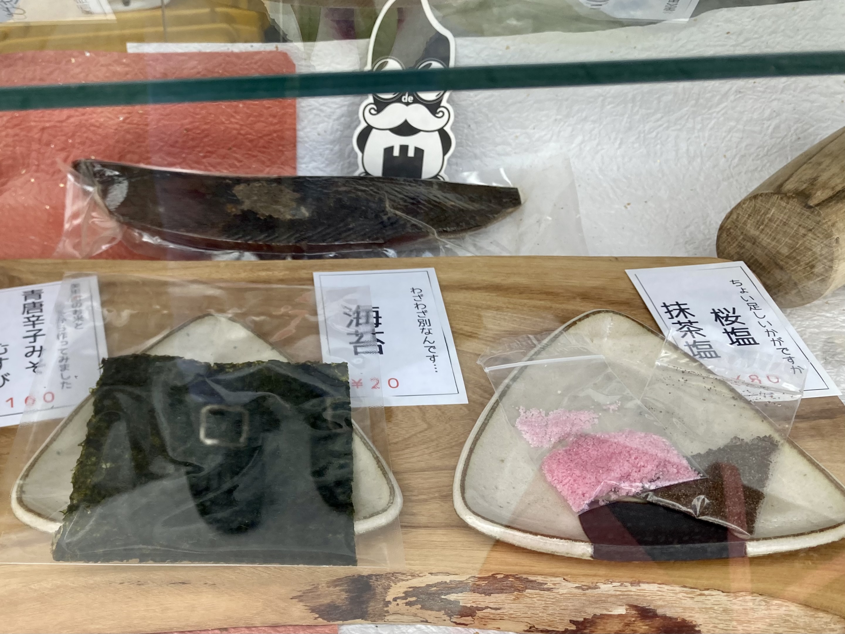 海苔と塩の別売り。これはオーナーさんのこだわりで、食べる直前に海苔を巻いて食べて欲しいんだとか。有明産の焼き海苔です。塩は追加用。ベースになる塩は仕入れたものだそうですが、それを使って桜塩、抹茶塩にするのは手作りだそうです。凄い。