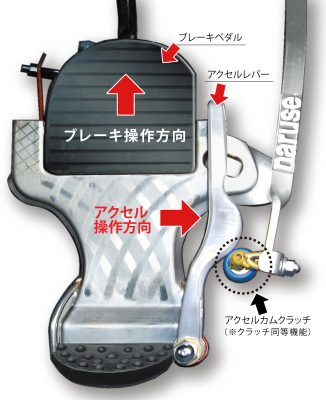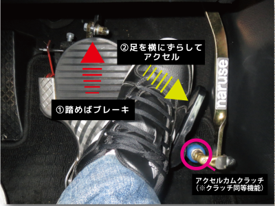 アクセルは踏むのではなく、足の先を少し横にずらす動作、つまり足を踏み替える必要が無く、事実上アクセルとブレーキをひとつのペダルで成立させている器具ということになる。