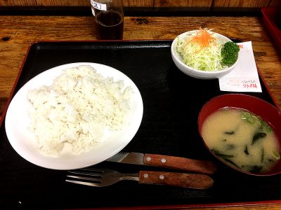 ご飯・味噌汁・サラダです。このステーキランチのご飯の量は300g。それでもご飯は多のですが、ほかの定食のご飯量は500gともっと多いらしいので、それにも驚きました。さすが「大盛り亭」といったところでしょうか。