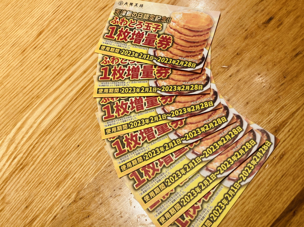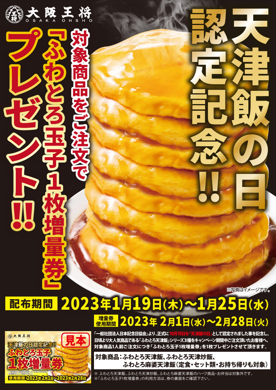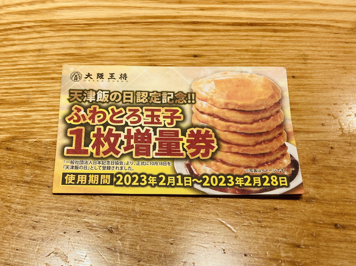 これは10月18日を正式に『天津飯の日』として認定されたことを記念して大阪王将でプレゼントされた「ふわとろ玉子1枚増量券」。※対象商品1人前ご注文につき1枚プレゼントするキャンペーンにより(2023年1月19日(木)~2023年1月25日(水))