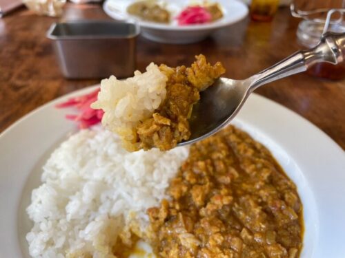 一口食べてみると、辛味は少なくマイルドな味で、どこか安心できる美味しさでスプーンが止まりません。