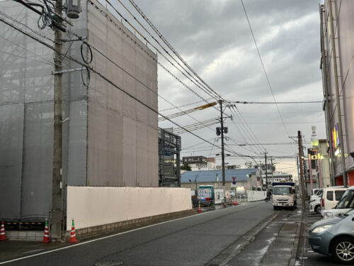 裏通りのスポラのところまで足場が!この裏側は以前駐車場だった気がします。