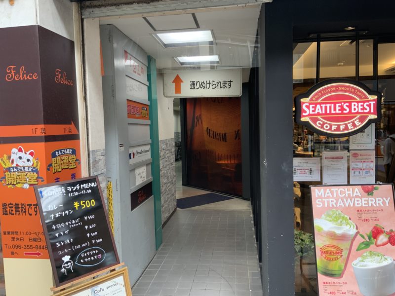 上通りアーケードを歩いていると、蜂楽万十のすぐ近くに「カレー ナポリタン 500円」と書かれた看板を発見!