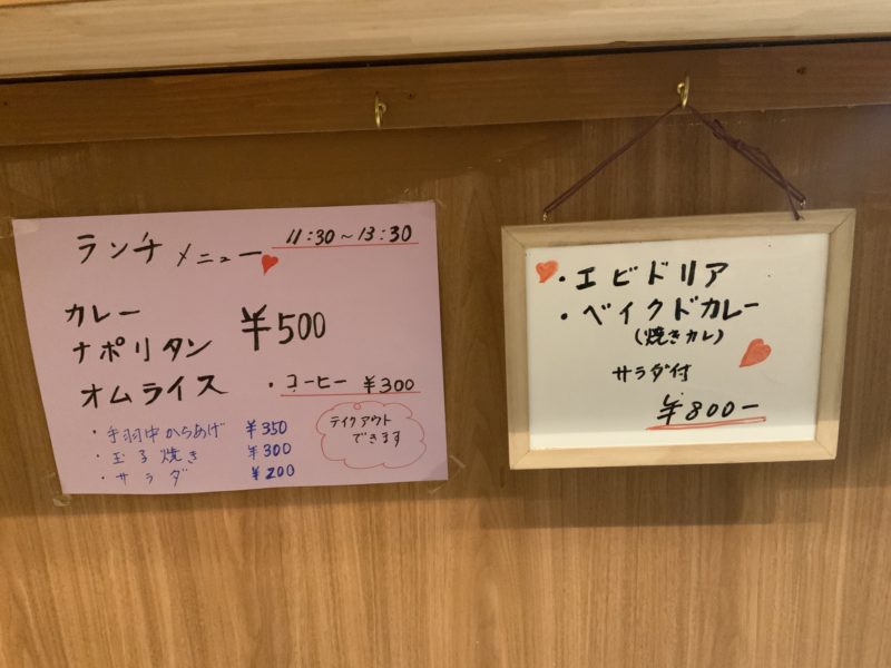 500円メニューはカレー、ナポリタン、オムライスの3種類。