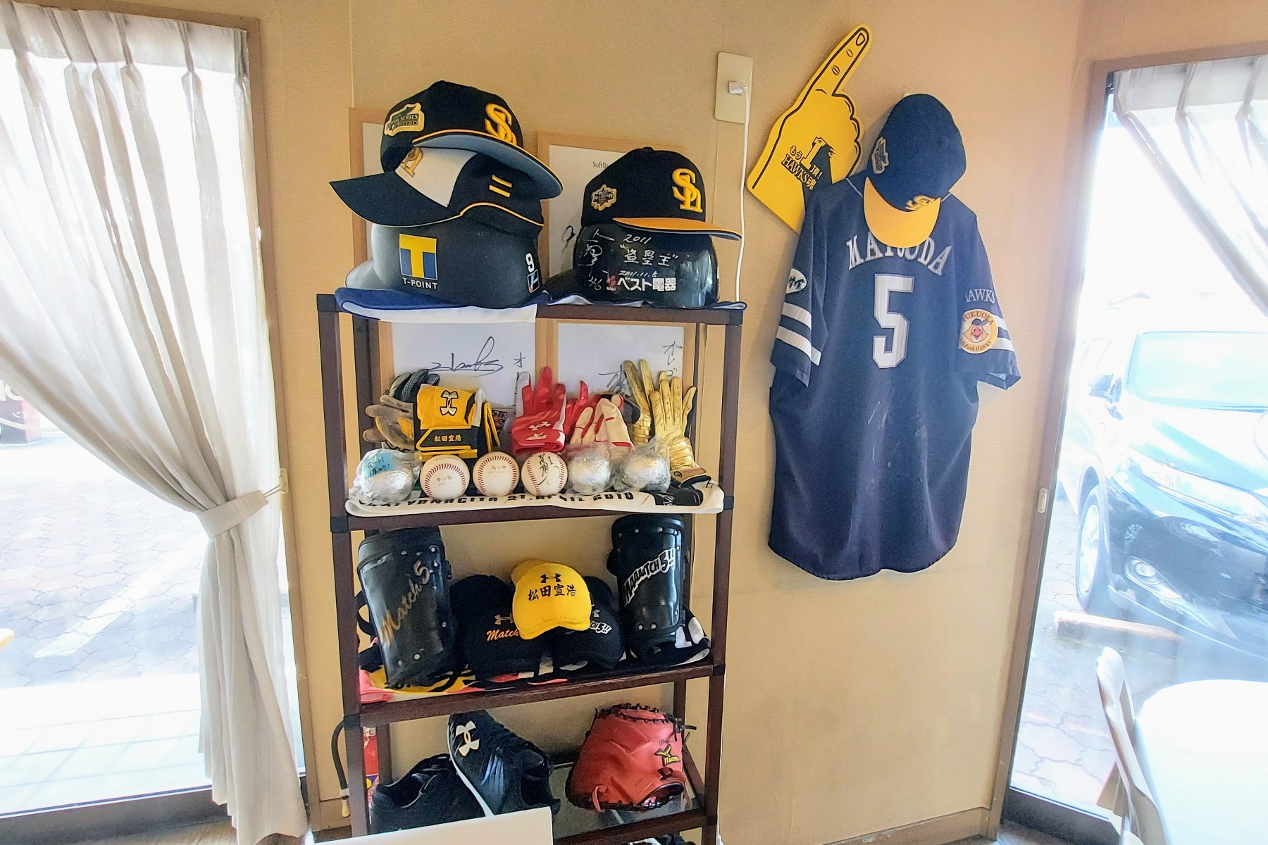 店内に入ると、まず目に飛びこんでくるのは壁一面のソフトバンクホークスのユニフォームや色紙。