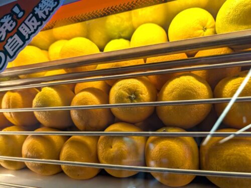中が見えるようになっている自動販売機の中にはオレンジがぎっしり!