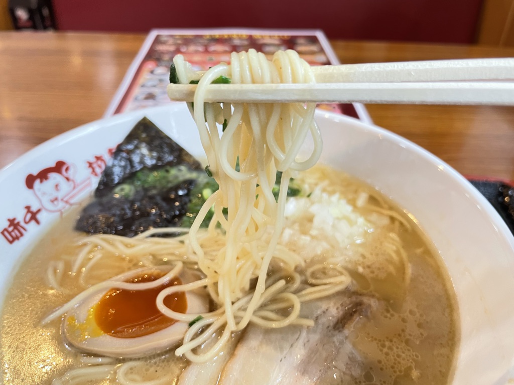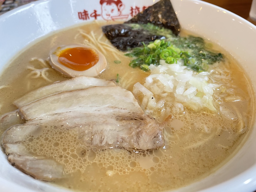 こんな感じのスープですから、随分と違います。同じ豚骨ラーメンなのですが、味千特有のマー油は入っておらず、クリーミーな仕上がり。個人的には刻み玉ねぎ入ってるのが嬉しい。