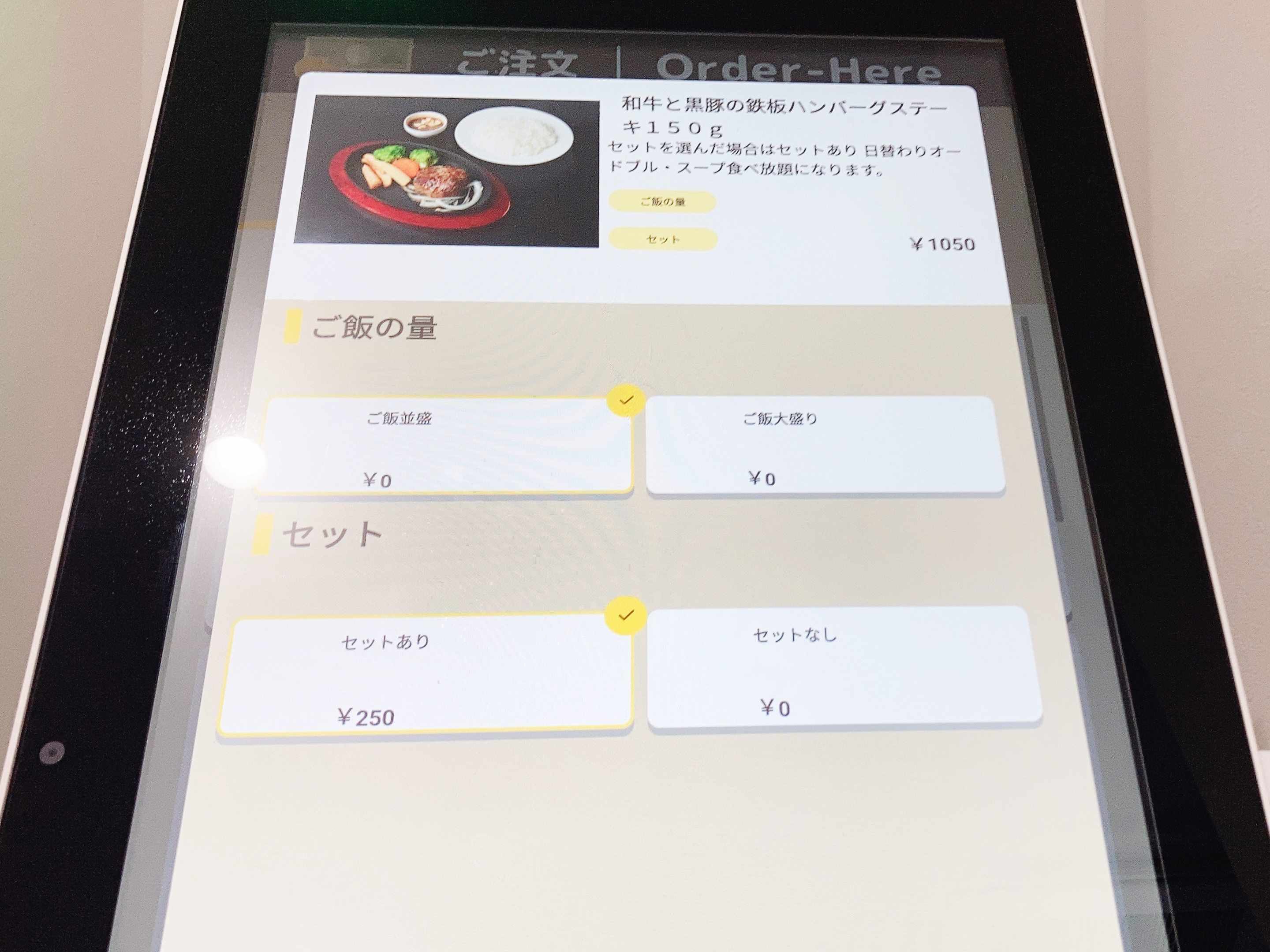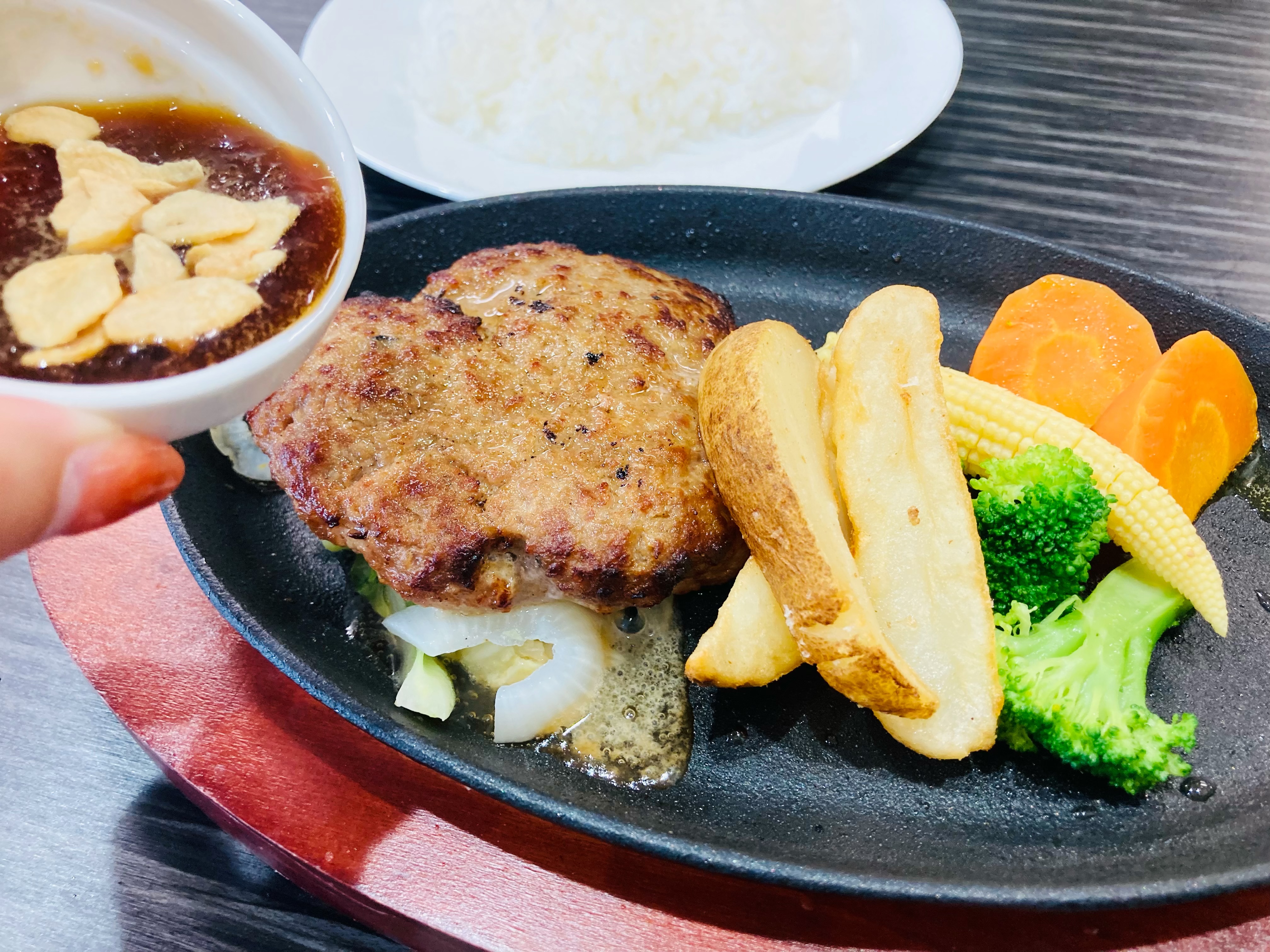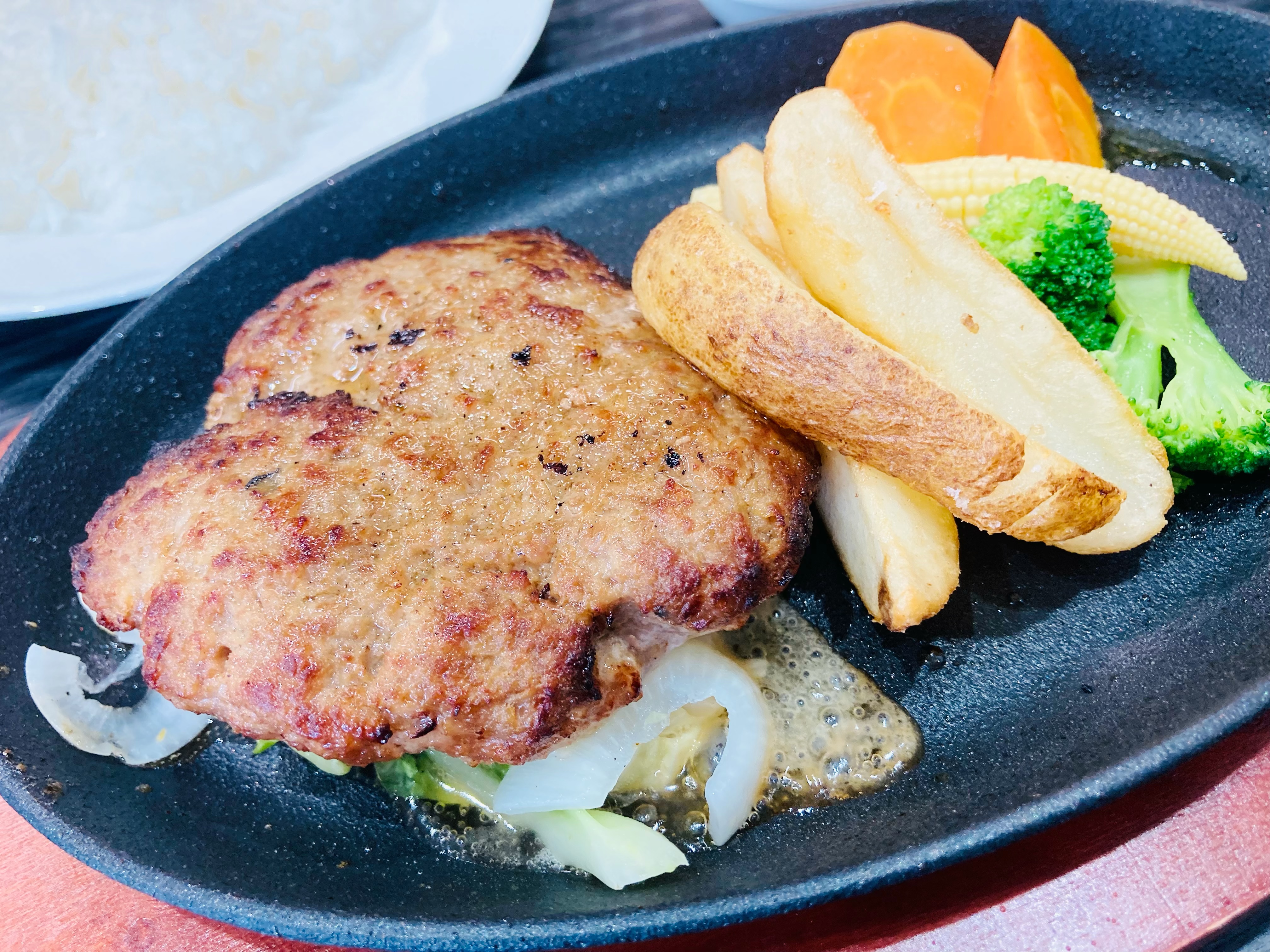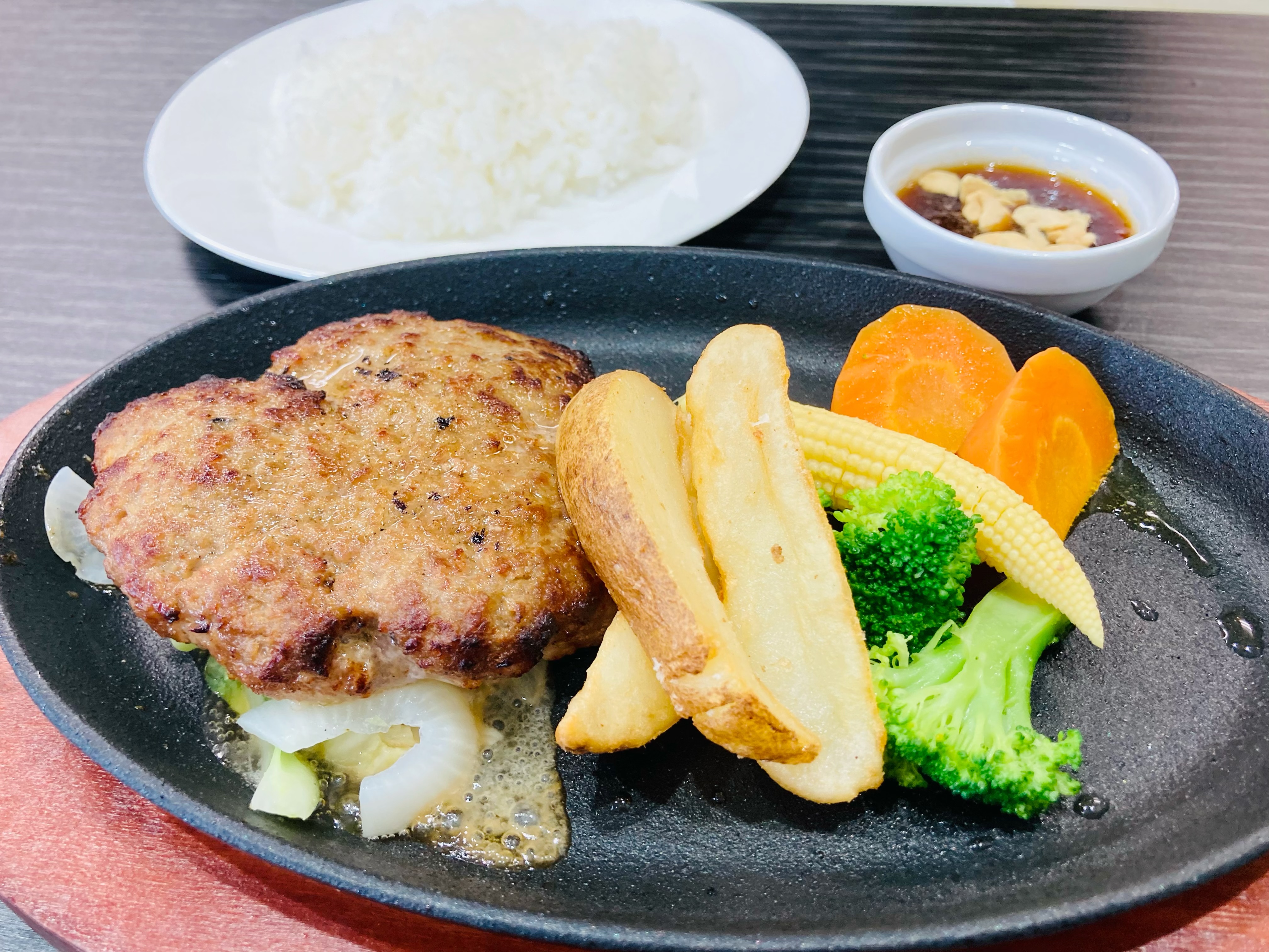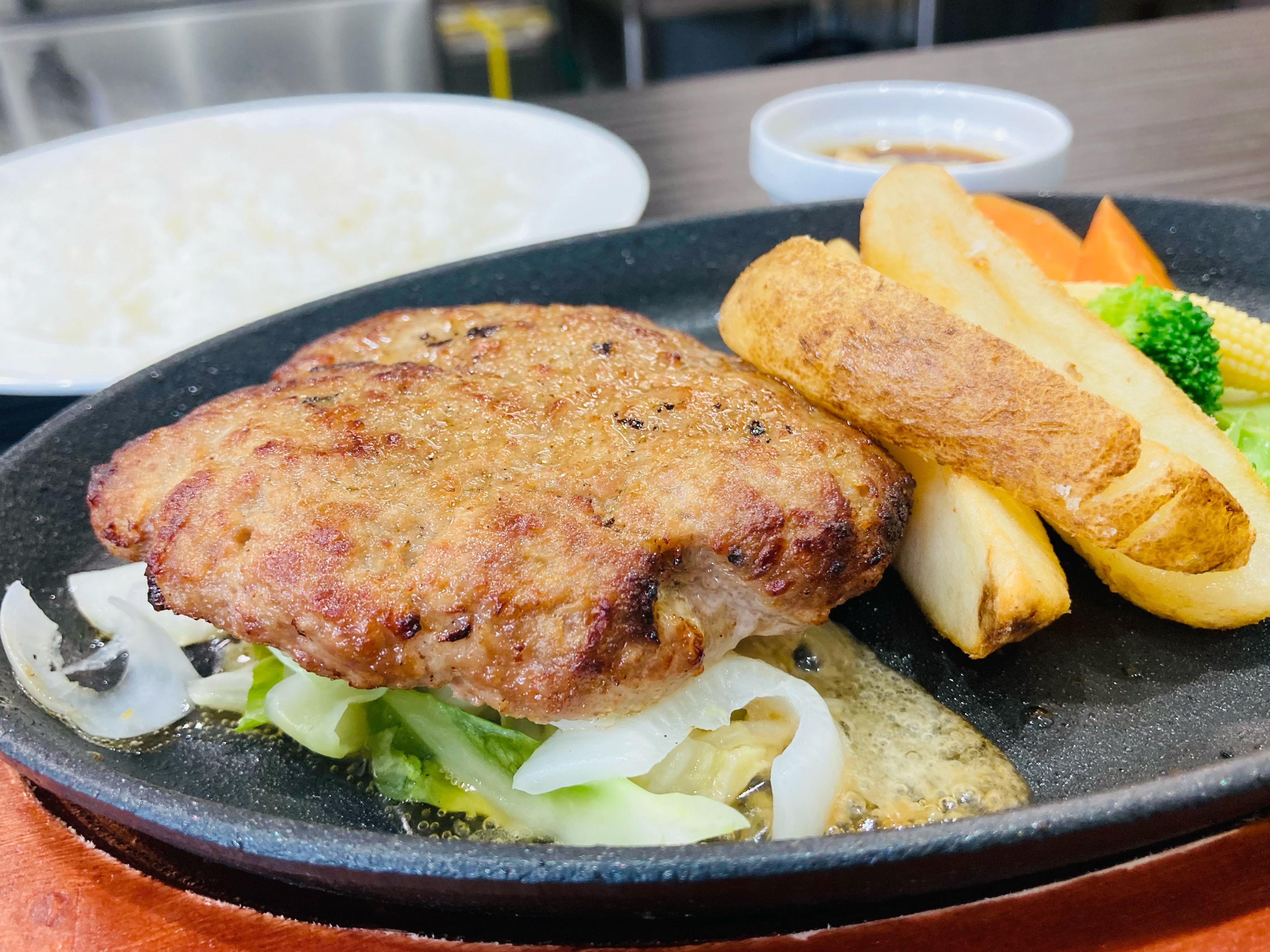 私は、お客さんの6割近くが注文するという和牛と黒豚の鉄板ハンバーグステーキ150gにしました!もちろん、セットありで!