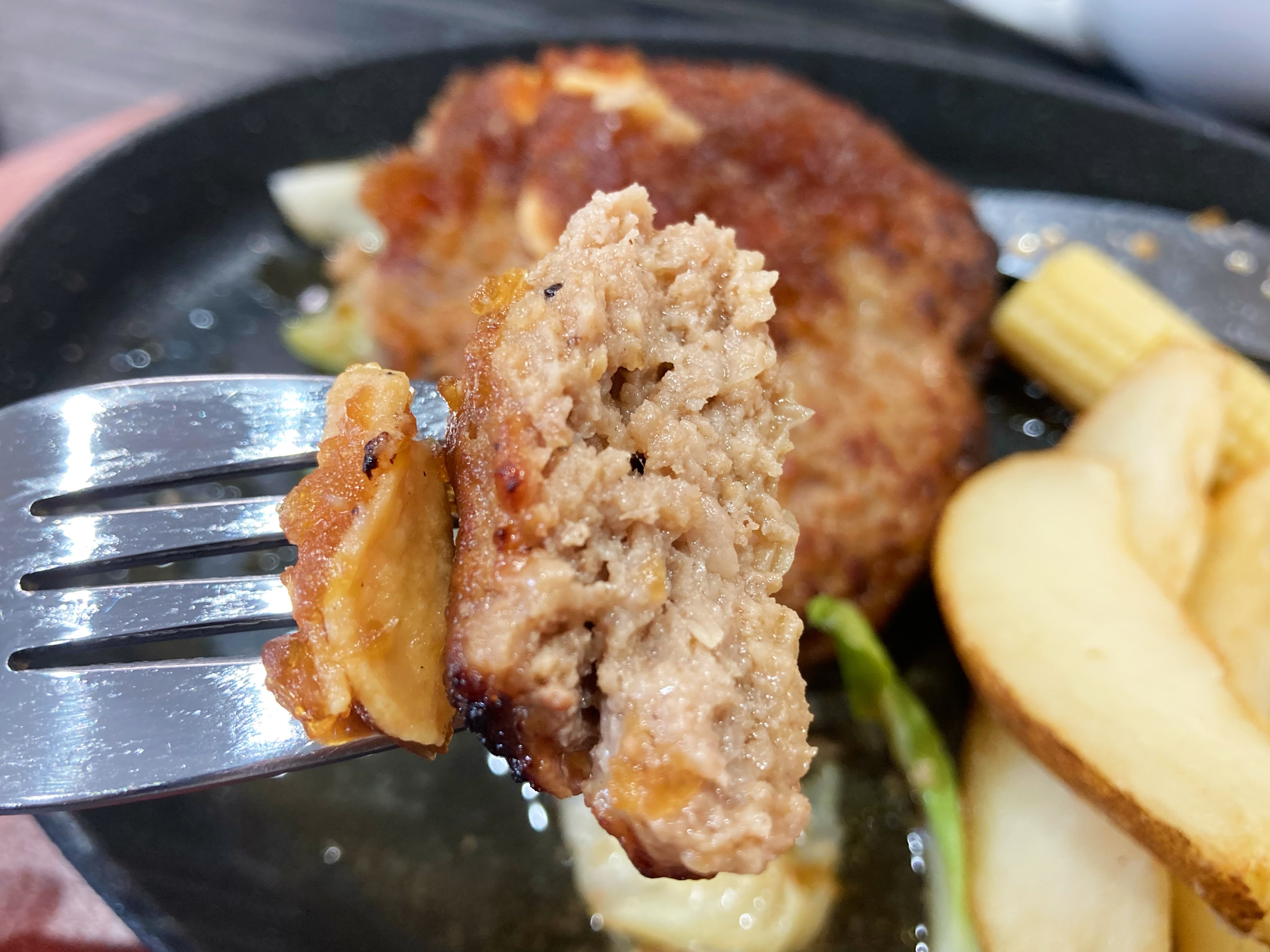 お肉は柔らかくて、フォークで崩れちゃうくらいです。そして、肉の旨味をダイレクトに感じるハンバーグ。