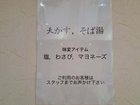 天かすとそば湯、味変アイテム(塩・わさび・マヨネーズ)は無料でもらえます。