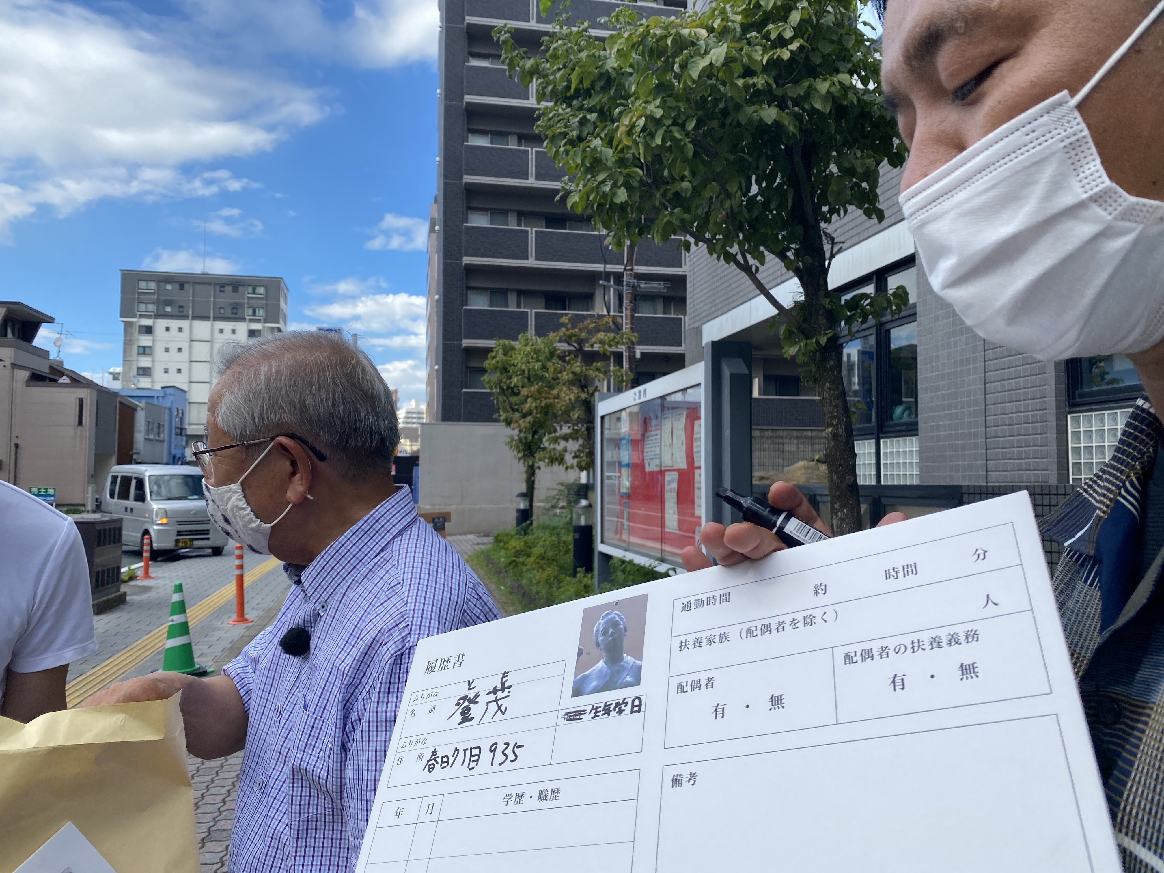 専門外だけど何かしら力になれれば、と雨が降りしきる中お話をしてくださった毛利さん。おてもやんの履歴書なるものを作成しました。