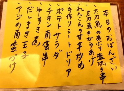 その日の食材によってメニューが毎日決まるので、いまま紹介している料理が必ずあるわけではありませんが、まずこれは、「太刀魚のあぶり塩焼き串」と「太刀魚の唐揚げ」。