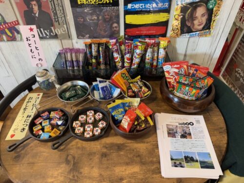 珈琲のお供に懐かしいお菓子が置いてあり、珈琲一杯に付き2つ。でも音楽に満たされていると、不思議とお腹が空かないんです。
