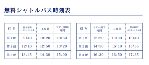 | シャトルバス発車時刻 | ・桜町バスターミナル9:40発→ツアー開始10:50 |