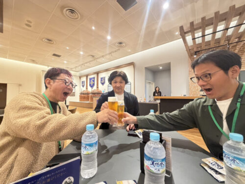三人がビールを見る目が、飲み物→生き物に変わった瞬間の写真です↑。