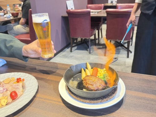 つまみはファイヤーハンバーグ!子供のように大はしゃぎなおっさん達…お店のご迷惑にならなければ良いが。