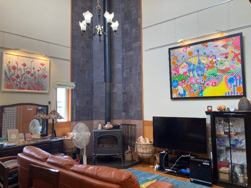 店内はこんな感じ。薪ストーブに華やかな絵画が目を惹きます。実際にここに住んでいるなんて羨ましい。