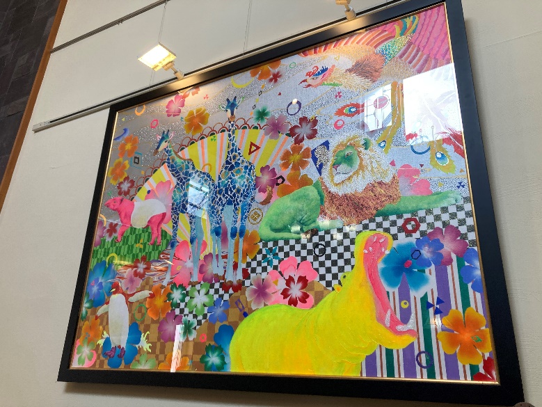 こちらがその絵画!なんと店主の息子さんである「Fujiyoshi Brother’s(フジヨシブラザーズ)」Fujiyoshi Brother’s(フジヨシブラザーズ)が描かれたものだそうです。テレビでも数々の作品が起用されている注目のアーティスト兄弟です。華やかな原画を前に、思わず見とれてしまいました。