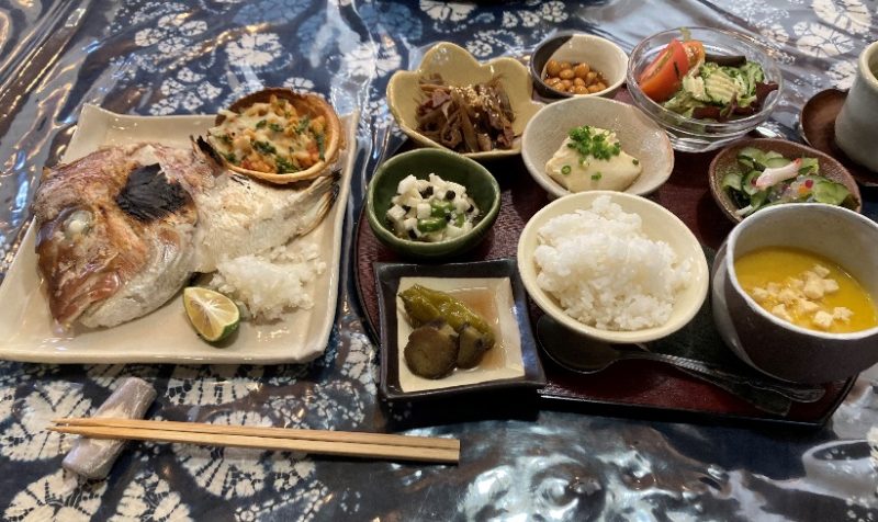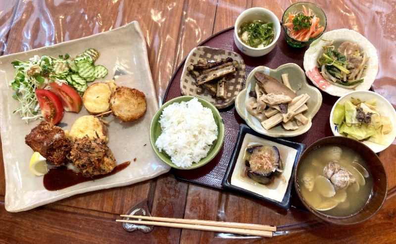 今日のおまかせランチは、太刀魚のチーズ巻き、ひじきのがんも、山芋とオクラのポン酢和え、ナスの揚げ浸し、ゴボウの甘辛たれ、あさりの味噌汁・・・品数なんと10品以上!全て手作りとは驚きです。