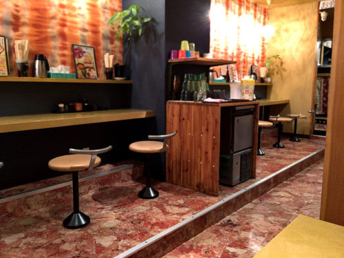店内には長いカウンター席があり、向かい側にはテーブル席も用意。縦長いお店の作りとなっています。